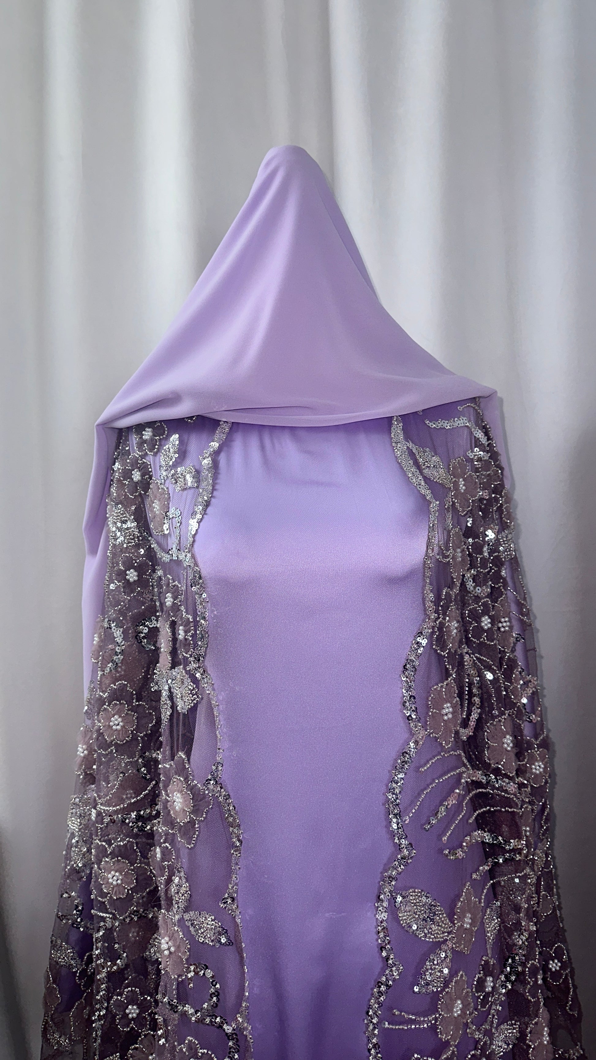 Each set includes a beaded mesh outer dress, an inner slip, and a matching chiffon hijab. The outer dress is detachable, allowing you to style it in various ways!
